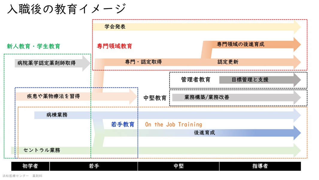 薬剤科では、OJT(On-the-Job Training)に加え、新人研修・若手教育・専門領域研修・中堅教育など、キャリアの各段階に応じた教育プログラムを整えています。認定薬剤師・専門薬剤師の資格取得を希望される方には、業務面・経済面・学術面からの支援を行い、取得を積極的に後押ししています。さらに、一部の認定薬剤師・専門薬剤師には給与面での優遇もあります。