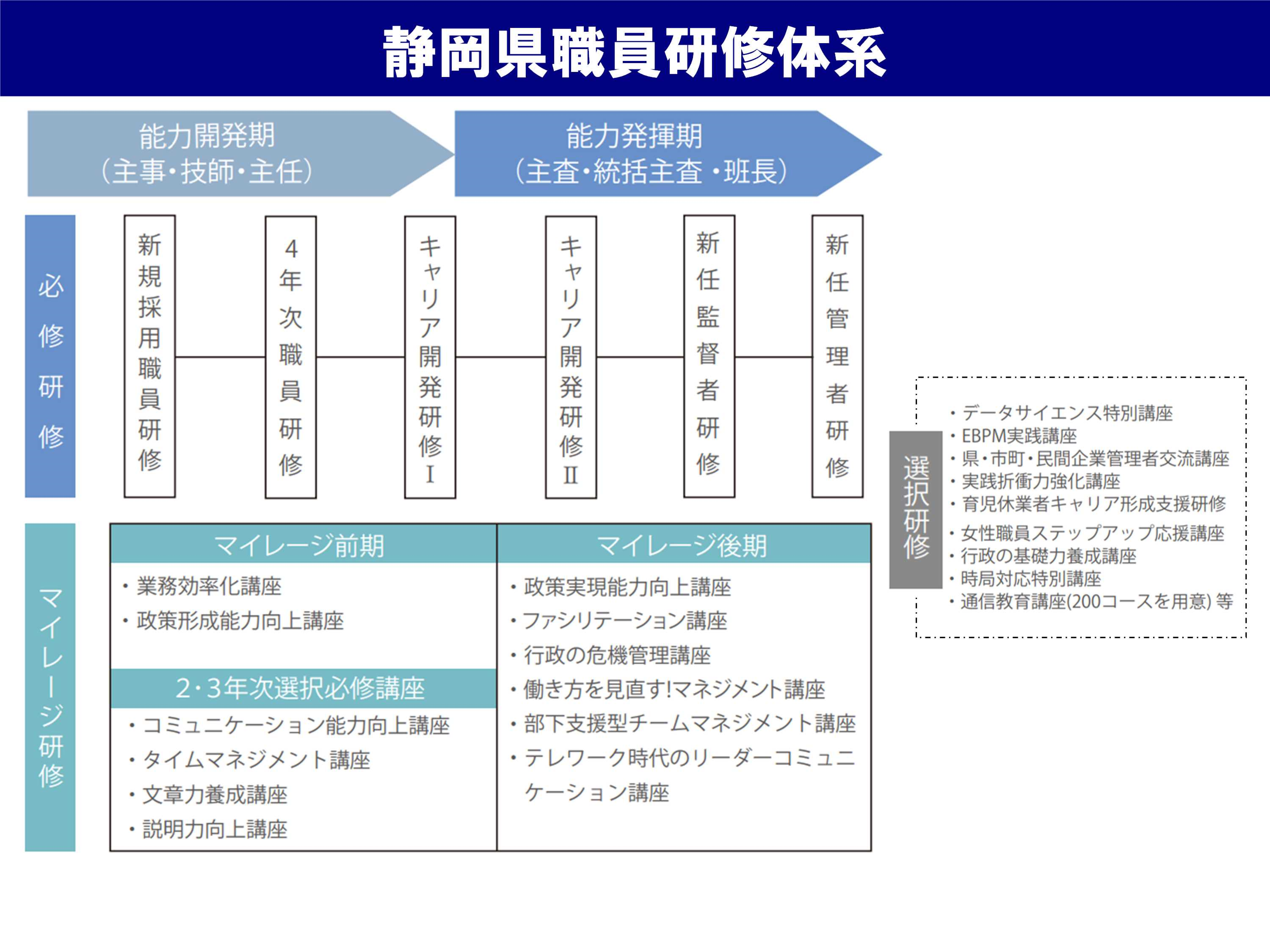 キャリア開発研修のための「静岡県キャリア・デベロップメント・プログラム」という育成プログラムがあり、職員がやる気・やりがいを感じられる組織風土を実現し、個々の能力アップと組織の活性化を図っています。