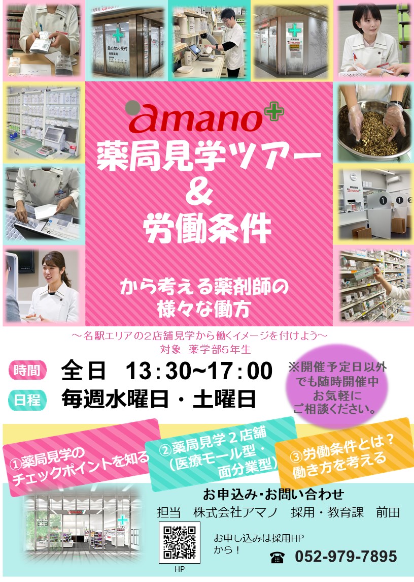 各コース名古屋の方々の美容と健康のトータルサポート企業を目指す株式会社アマノの調剤薬局で働く薬剤師の働き方やお仕事内容を知っていただけるプログラムとなっています。